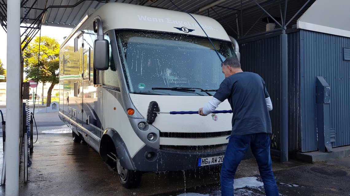 Jedenfalls war unser Monsterchen nach immerhin schon über 3.000 Kilometern total verdreckt und hatte sich eine kleine Waschung echt verdient. Wolfgang hat das wirklich super gemacht 😉