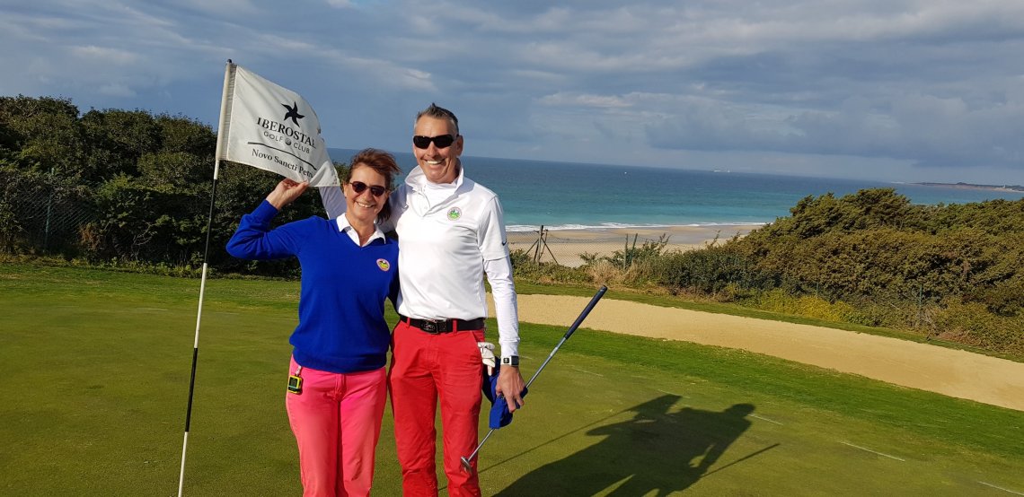 Zum ersten Mal in unseren Ferien war nicht nur eitel Sonnenschein. Einige größere Wolken und ein frischer Wind, zum Schluss sogar ein paar Regentropfen, konnten uns die Freude am Spiel dennoch nicht nehmen. Zwei sehr nette Holländer haben uns über den Platz „begleitet“ und am Signature Grün dieses Erinnerungsfoto von uns gemacht..